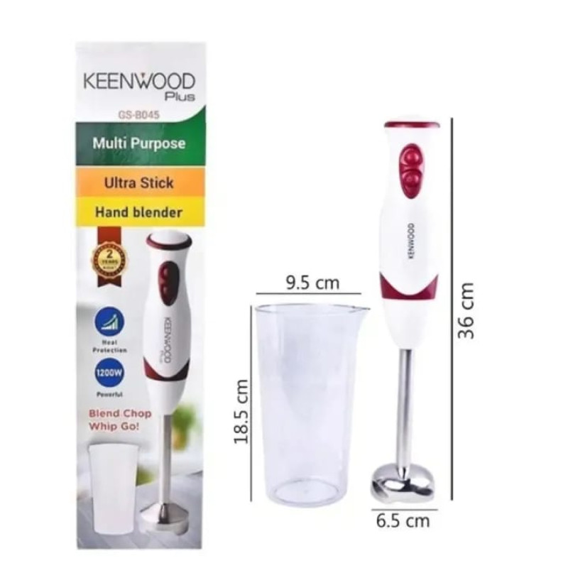 Blend, chop, whip, and puree like a pro with the Kenwood GS-8045 Ultra Stick Hand Blender! This powerful 1200W immersion blender features a durable stainless steel 4-blade system for fast, smooth results in soups, smoothies, sauces, baby food, batters, and more. The ergonomic grip, variable speed control, and heat protection ensure comfortable, safe operation. Includes a 600ml measuring beaker for easy blending and measuring. Compact, easy to clean, and perfect for everyday kitchen tasks — the ideal tool for quick, mess-free food preparation at home!